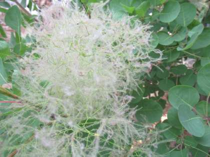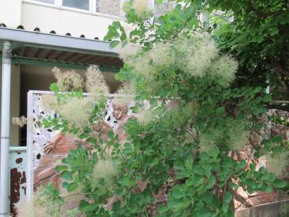 さっそくインターネットで調べると、「スモークツリーはウルシ属に近縁な、雌雄異株の落葉樹。」「雌木の枝先につく花序は長さ約20cmで多数枝分かれし、花後に伸びた花柄が遠くからは煙がくすぶっているように見えます。」といった記事を見つけました。