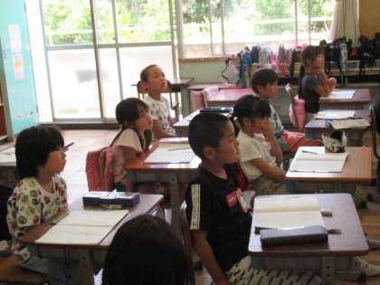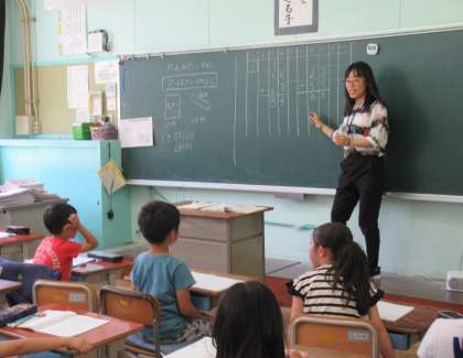 2年生の算数です。習ってきたたし算の筆算の、練習問題を解いていました。確実に身につけるために、先生がポイントをしっかりと押さえ、一人一人の意識を高めていました。