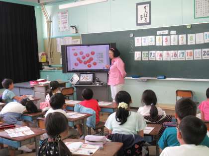 3年生の外国語活動です。How many〜?の質問に対して、数字を答える活動をしていました。たとえばりんごがいくつあるか、といったやりとりです。自然に数の言い方が身についていきます。
