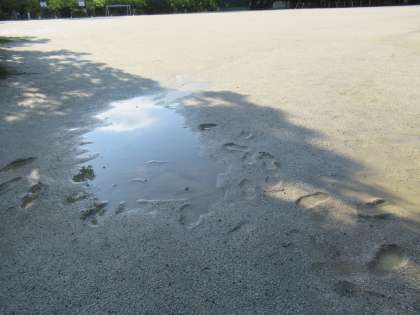 運動場は、昨夜の大雨で、かなり地面が軟らかく、ぬかるんでいます。ところどころ水たまりもあります。