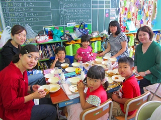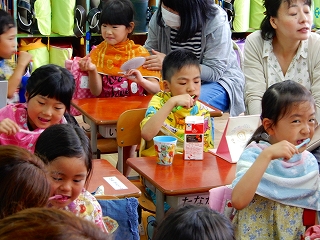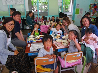 6才臼歯のお話を聞き,染め出しをして,正しい歯の磨き方を教えていただきました。その後,親子で楽しく給食を食べました。