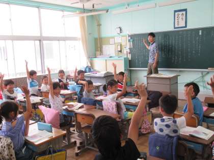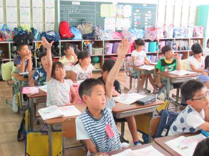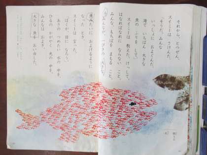 2年生の国語です。「スイミー」の授業が進んでいます。今日は、いよいよ大きな魚を追い出す場面。スイミーの活躍の様子を、みんなで読み取っていました。