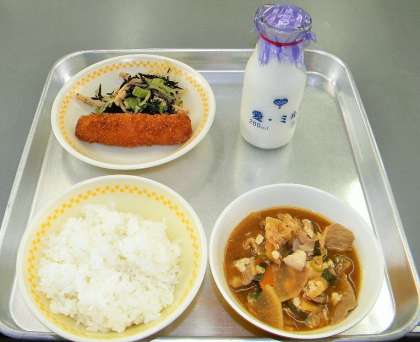 うーん。つまり、どちらも正しいということになりますね!というか、どちらであろうとおいしさに変わりはありません。今日の「実だくさん汁」は、要するに豚汁です。写真のとおり、たしかにすごい実(具)の量です。うんちくが長くなってすみません。とにかく、今日もおいしい給食です!