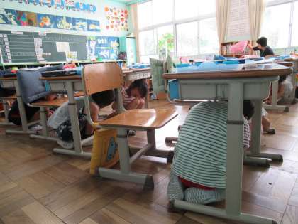 本日10:00に地域の防災放送で、地震の訓練放送が流れました。本校では、その訓練放送に合わせて、一次避難の訓練(揺れがおさまるまで身の安全を確保する訓練)を行いました。普通に授業をしている最中に、ほんの2〜3分を使っての訓練ですが、みんな落ち着いて安全を確保していました。