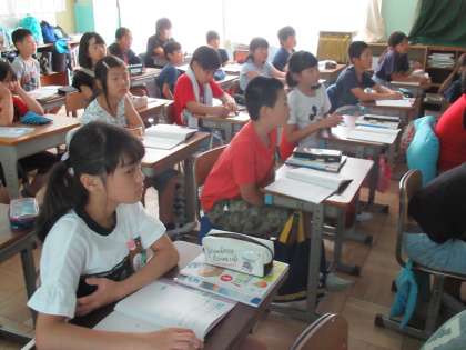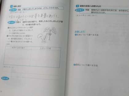 5年生の理科です。インゲンマメについて学習が進んでいます。今日は、実際に子葉がしぼんでいる様子に着目し、なぜしぼむのか考えていました。まず、映像資料を見て、それをもとにして予想を立てていました。