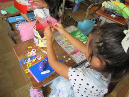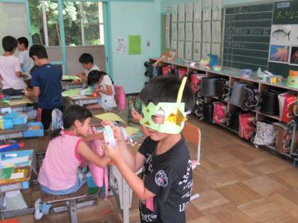 2年生の図工です。「わっかでへんしん」という楽しい活動をしていました。細長い色画用紙をわっか状に加工してお面を作っていました。いろいろな装飾がされていて、とっても華やかですね。
