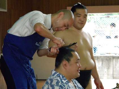 床山さんが、玉鷲関の髷を結うのを見せていただきました。