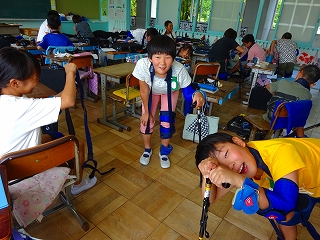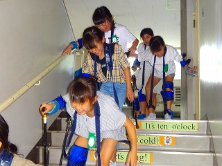 腰を曲げた体勢は立っているだけでも辛かったようですが、階段を下りたり上ったりすることで、「階段を下りる時は怖かった」と言っている子もいて、より高齢者の方の気持ちが分かったようです。