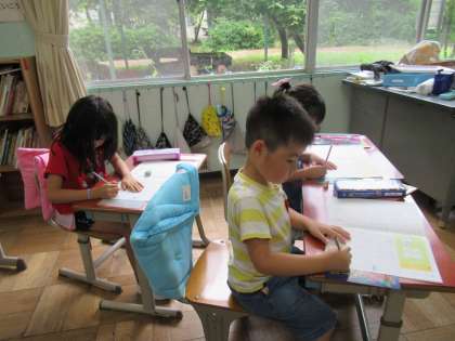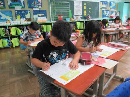 1年生の書写の様子です。国語の授業で習ったひらがなを、書写として学習しています。「むぎちゃ」「きって」などの字を、「ゃ」「っ」など、小さい字の書き方に気をつけて練習していました。
