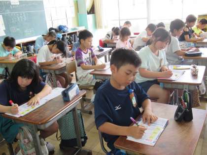 5年生の国語で、ドリルを使って漢字の学習をしていました。非常に難しい漢字を扱っています。全員で、書き順や読み方などを確認しながら、学習が進んでいました。蒸し暑い日になりましたが、エアコンのおかげで、なんだか学習がはかどっているようでした。