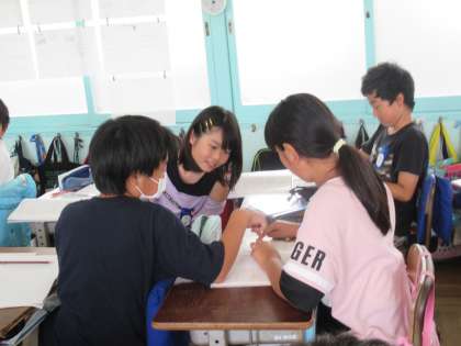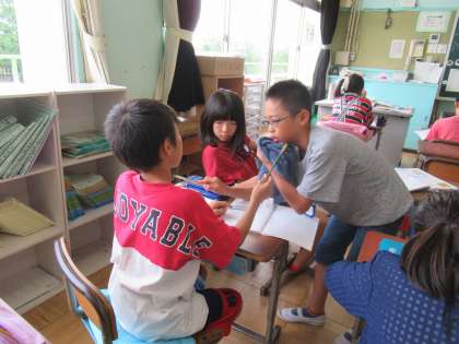 6年生の算数で、「比を使った問題」という学習をしていました。ここまで学んできた比を利用し、さまざまな文章題にチャレンジしています。グループで考え方を話し合い、学びを深めています。相手に説明することで、より理解が深まります。こういうことができるのも、高学年ならではですね。