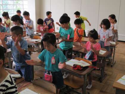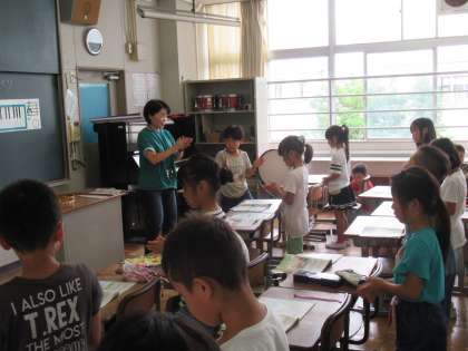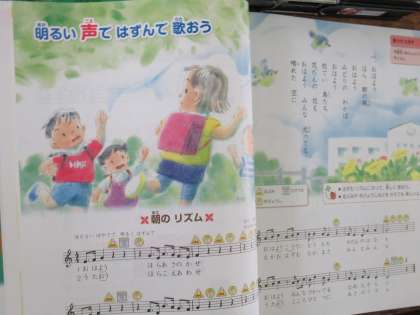 2年生の音楽の様子です。低学年音楽室からとっても楽しそうな歌声が聞こえてきましたので、つられるように部屋に入ってしまいました。「朝のリズム」という歌を体全体を使って、手拍子も入れながら、楽しく歌っていました。みんなノリノリでした。