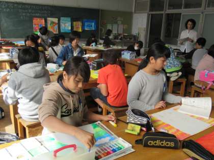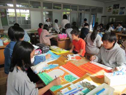 6年生の図工で「想像のつばさを広げて」の学習が進んでいます。自分なりの想像の世界を絵にします。大空、大海原などをイメージして生き物などを登場させ、想像の世界をダイナミックに絵にしていました。色の使い方を工夫して、非現実的な世界を創造している子もいました。