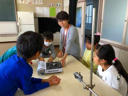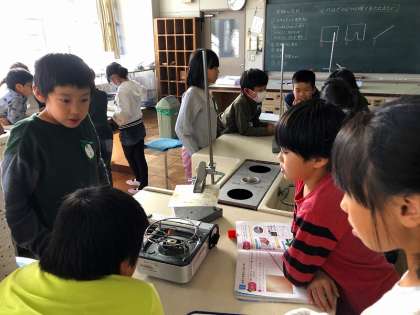 理科の「もののあたたまり方」の学習で実験を行いました。金属のあたたまり方を調べるために、初めてガスコンロを使って実験をしました。金属板に塗ったろうが、熱した部分から徐々に広がるように溶けていく様子を楽しそうに観察していました。