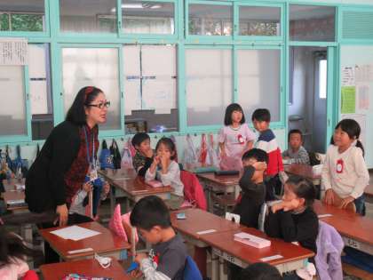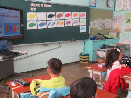 1年生の外国語活動の様子です。本校では、低学年でも学期に1回、このように英語に親しむ活動をしています。ゲームや会話のやりとりを楽しみながら、日常生活で親しみのある英語に無理なくなじんでいきます。What color do you like?という問いかけに、I like 〜という答え方で、自分の好きな色を答えていました。黒板でいろいろな色の言葉をすでに学んでいるので、全員が簡単に答えることができました。