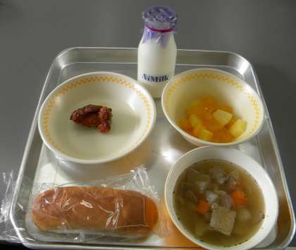 今週は「地元の旬を味わう 学校給食週間」です。今日の地元の旬は、スープに入っているれんこんと、米粉パンの米でしょうか。秋は実りの季節で、食べ物がおいしいですね。感謝していただきましょう。