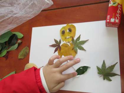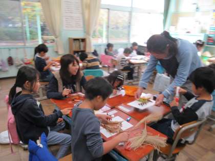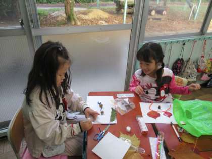 1年生の生活科です。持ち寄ったドングリや木の葉、ススキなどをつかって、絵をつくっていました。葉っぱの形を生かしてライオンにしたり、亀や鳥にしたりと、あれこれ考えながら、たのしく絵を仕上げていました。秋を思う存分楽しんでいます。