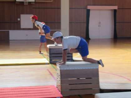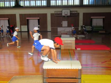 2年生の体育は、体育館でとびばこをやっていました。学習カードを参考にし、「とびのり・おり」の練習です。跳び乗ったときにひざをつける方法と、足の裏をつける方法の両方を練習していました。先生に教えてもらい、上手な友達の動きも参考にして、繰り返し練習していました。