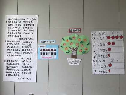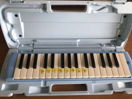 ひんと1 ピアニカや ピアノなどの がっきが おいてあります。