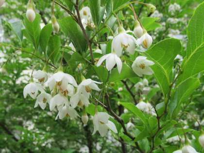 今日の写真は中庭(1年3組の前)に植えられている樹木です。今、きれいな花を咲かせています。下向きに花を咲かせているところが特徴です。先日まで藤の花に集まっていたクマバチが、いまはこの木に集まってきています。