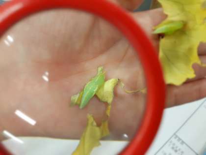 2.「手で持てないもの」は,虫めがねを目に近づけて,見るものに顔を近づけます。(しゃしん2)