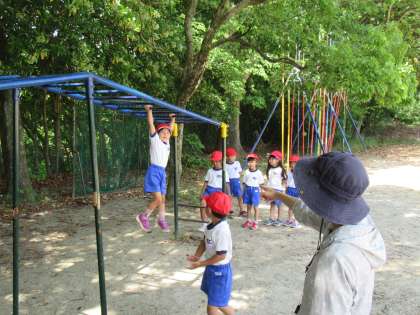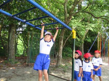 1年生の体育です。スタートカリキュラムの体育領域の活動で、着替え、マスクの着脱、水分補給、手洗い、整列などなど、教室から一連の流れを学ぶことも学習です。今日は、運動場の日陰にある雲梯で楽しく活動していました。
