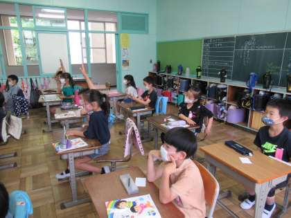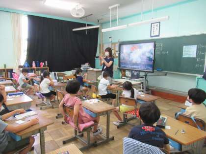 2年生の生活科「やさいをそだてよう」の学習です。臨時休業中だったので苗は教師が植えましたが、学校再開後の観察は子どもたちの目で行うことができています。新しく入れていただいた電子黒板が大活躍。NHK for Schhoolの動画を活用して、育て方の工夫について学んでいました。