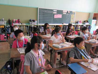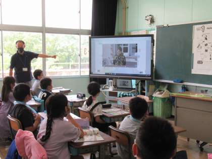3年生の外国語活動です。世界のさまざまなあいさつについて学んでいました。電子黒板に表示されるデジタル教材で、さまざまな国のあいさつがどんどん出てきます。あいさつだけでなく風景などの映像も出るので、「あ、オーロラの国だ!」などと子どもたちもすぐに引き込まれていきます。