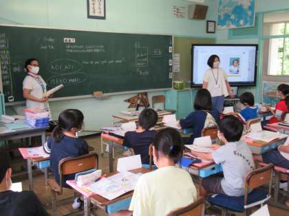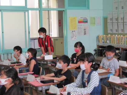5年生の外国語科です。6年生と同様に教科書を使っての授業になります。名前やすきものを伝える表現、語句を身につける学習が進んでいきます。3〜4年生の外国語活動とはちょっと違う雰囲気がありますね。昔なら中学1年生の内容ですよね。