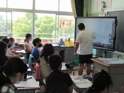 6年生の算数で、逆数について学んでいました。分数の扱いがこれでまた広がりますね。電子黒板のデジタル教科書を教師が扱って、授業が効率よく進んでいます。画面に自然と目線が集まります。教師にとっても子どもにとってもありがたいアイテムです。