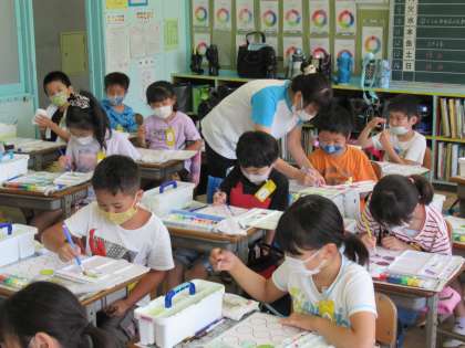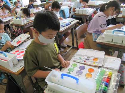3年生の図工です。絵の具の学習が進んでいます。今日は、色を混ぜたり、水の量を変えたりして、どのような色ができるかを学んでいました。これからさまざまな活動で使用しますので、道具の使い方や絵の具の特徴をここで確実に身に付けます。
