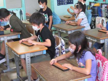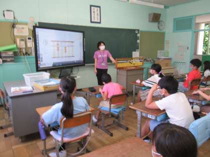 4年生の算数です。そろばんの学習をしていました。実生活でも使われなくなった道具ですが、そろばんの仕組みを理解してたし算、ひき算の学習をしていきます。本当に限られた時間で基本中の基本のところを学びます。