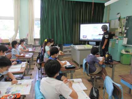 4年生の理科です。本当なら4月からじっくり観察していくヘチマについて、種の様子を確認し、4〜6月上旬の様子は映像資料で確認して理科ノートに記入し、そして、いよいよ図工室前に植えられているヘチマの現在の様子を観察に行きます。こういう工夫をして臨時休業中の学習を補い、授業を進めていきます。