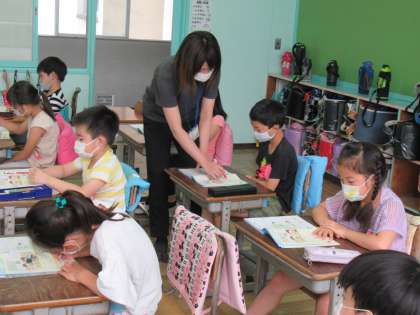 2年生の算数です。「たし算とひき算」の学習に入りました。今日は、2けた+1けたのたし算です。10の束がいくつになるか考え、正確に答えを出すようにしています。どんどんと難しくなっていきますね。