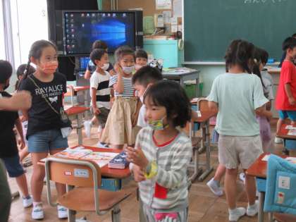 1年生の音楽です。音楽の授業はコロナウイルス対策で制限がありますが、換気に注意して、できるだけ活動をしています。「おんがくにあわせてあるこう」という単元名のとおり、音楽に合わせて楽しく歩いていました。流している音楽にしかけがあり、拍がわかりやすく、テンポや曲調が変わったり、休止したり・・・。みんな楽しく活動していました。