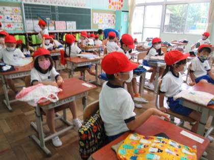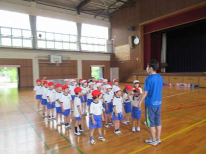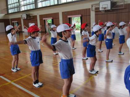 1年生の体育です。スタートカリキュラムの中の体育の領域の指導です。教室での準備、体育館への移動、そして、整列や体操隊形。最後にラジオ体操もやってみました。とにかく先生のまねっこをしながらがんばっていました。
