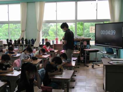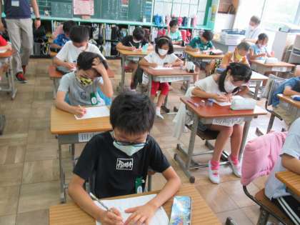 4年生の国語です。学習してきた「白いぼうし」に出てきた漢字について、小テストを行っていました。学習したことが定着しているか確認して、次に進んでいきます。みんな学習の成果を発揮することができたかな。