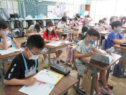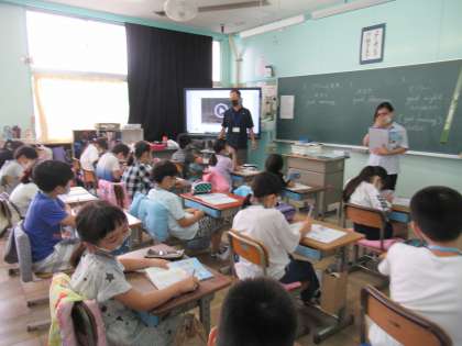 4年生の外国語活動です。「あいさつをして好きなものをたずねよう」という学習をしていました。まずは映像を見て、登場した人たちがどんな物が好きが聞き取っていました。寿司、ぎょうざ、小籠包・・・。いろいろ出てきていました。