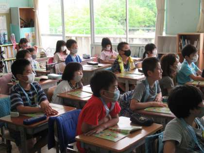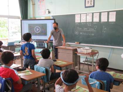 3年生の外国語活動です。電子黒板の楽しい映像を見ながら、どんな会話をしているか考えていました。「ランチ」とか「ボール」とか、日常的に使われている言葉をたよりに、みんなで考えていました。