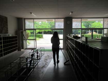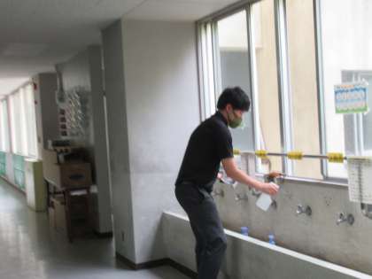 下校指導後、教職員で清掃・消毒作業をし、来週に向けて環境を整えました。