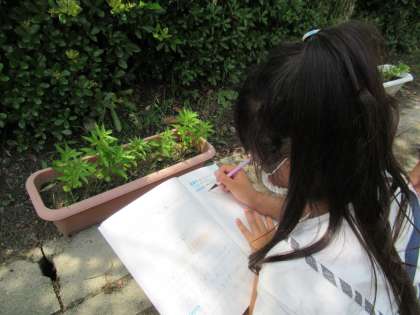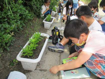 3年生の理科です。ホウセンカの観察を続け、植物の体のつくりについて学んでいます。先週の6/9から約1週間で、びっくりするくらい葉の数が増えましたね。定規で葉の大きさなどもはかって、記録していました。