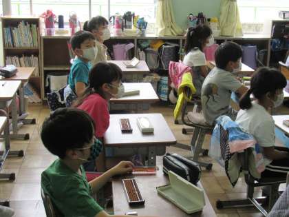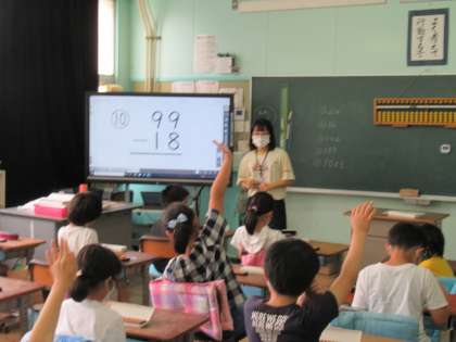4年生の算数です。そろばんについては、昨年度3学期できなかった部分を補う領域です。教材、教具が限られているので、各学級、授業日を別の日に設定して学習しています。計算の仕方の基礎のところを学んでいます。