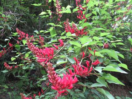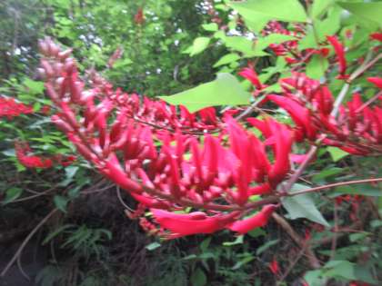 北館の校舎の裏の土手に、赤い花が咲き始めました。ちょうど1年1組の廊下から見えます。インターネットで調べてみたら、「サンゴシトウ」という木のようです。燃えるような赤。これから9月頃まで咲き続ける花期が長い花だそうです。