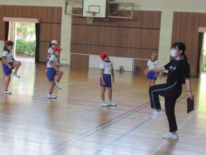 2年生の体育です。体のバランスをとる運動をしていました。先生が示すさまざまなポーズを真似していました。目標は30秒です。先生が示すポーズはすべて体のバランスをとる運動になっているのですが、子どもたちにとっては楽しい活動でした。