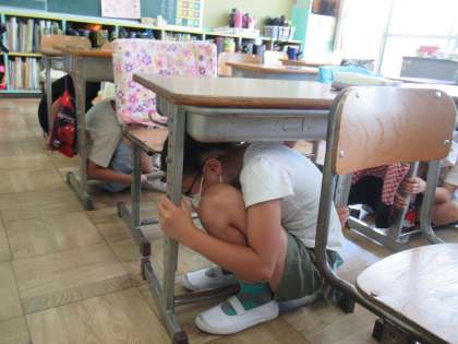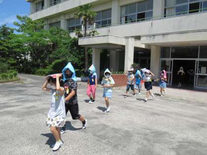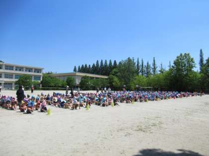 今日の2時間目は、延期になっていた地震避難訓練を実施しました。授業中を想定した基本的な避難訓練で、基本的な避難経路の確認と、「お・は・し・も・す・き(おさない、はしらない、しゃべらない、もどらない、すばやく、きく)」を児童に浸透させます。一次避難で机の下にもぐって命を守り、二次避難で運動場に移動しました。運動場では、ソーシャルディスタンスを確保するために学級と学級の間隔を広くとりましたので、運動場いっぱいに広がりました。