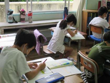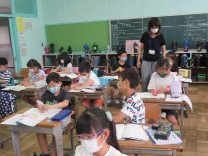 2年生の算数です。長さの学習が進んでいます。センチメートルという単位を習い、教科書のさし絵の長さをさっそくはかっていました。ミリメートルや直線のひき方などもこれから学んでいきます。