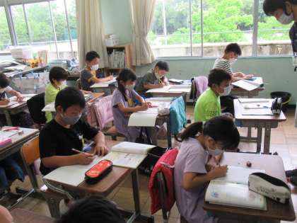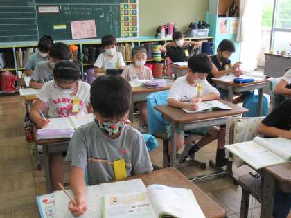 3年生の算数です。わり算の学習のまとめに入りました。おかしが16個あって2人に同じ数ずつ分けると一人分は何個になるか、一人に2個ずつ分けると何人に分けられるか、といったさまざまな問題を考えていました。