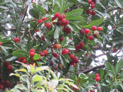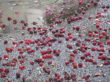 完熟のヤマモモ。大量に地面に散らばっています。これがイチゴだったらたくさんおいしいジャムができそうだなあ・・・。
