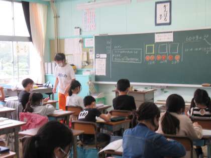 3年生の算数です。答えが10をこえるわり算の学習をしています。今日は、3個で60円のチョコレートの1個分の値段を考えることを通して、基本的な考え方を学んでいました。