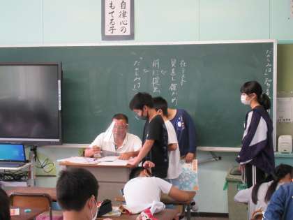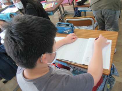 6年生の国語です。短歌の学習をし、実際に自分でも歌をつくっていました。「知多の友」で構想を練り、先生にアドバイスをもらい、清書をします。学んだことを生かして、自分なりの作品を仕上げていました。
